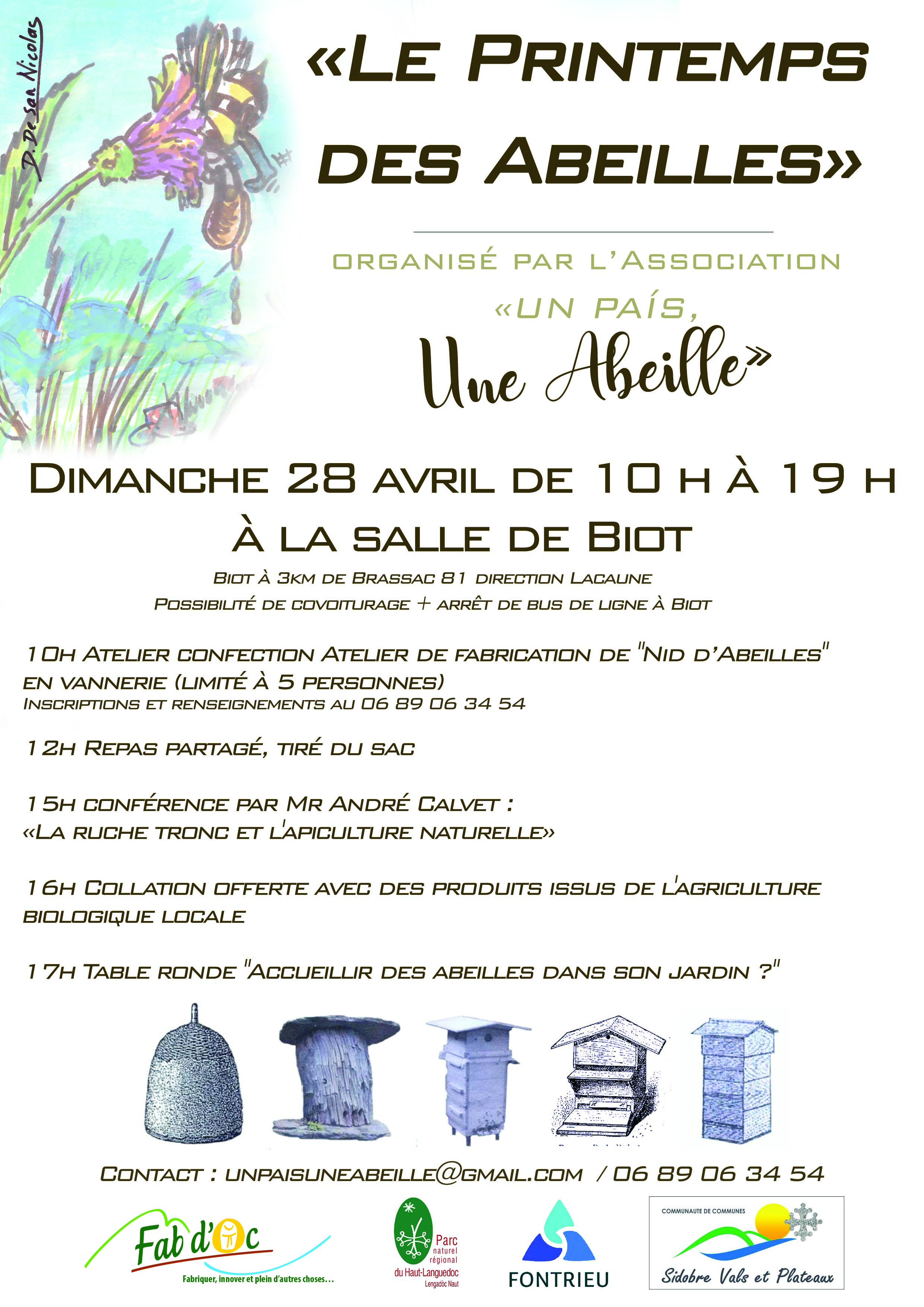 L'association « Un Pais, une Abeille » organise une journée intitulée « Le printemps des abeilles » le dimanche 28 avril de 10h00 à 19h00 à la salle communale de Biot, commune de Fontrieu.